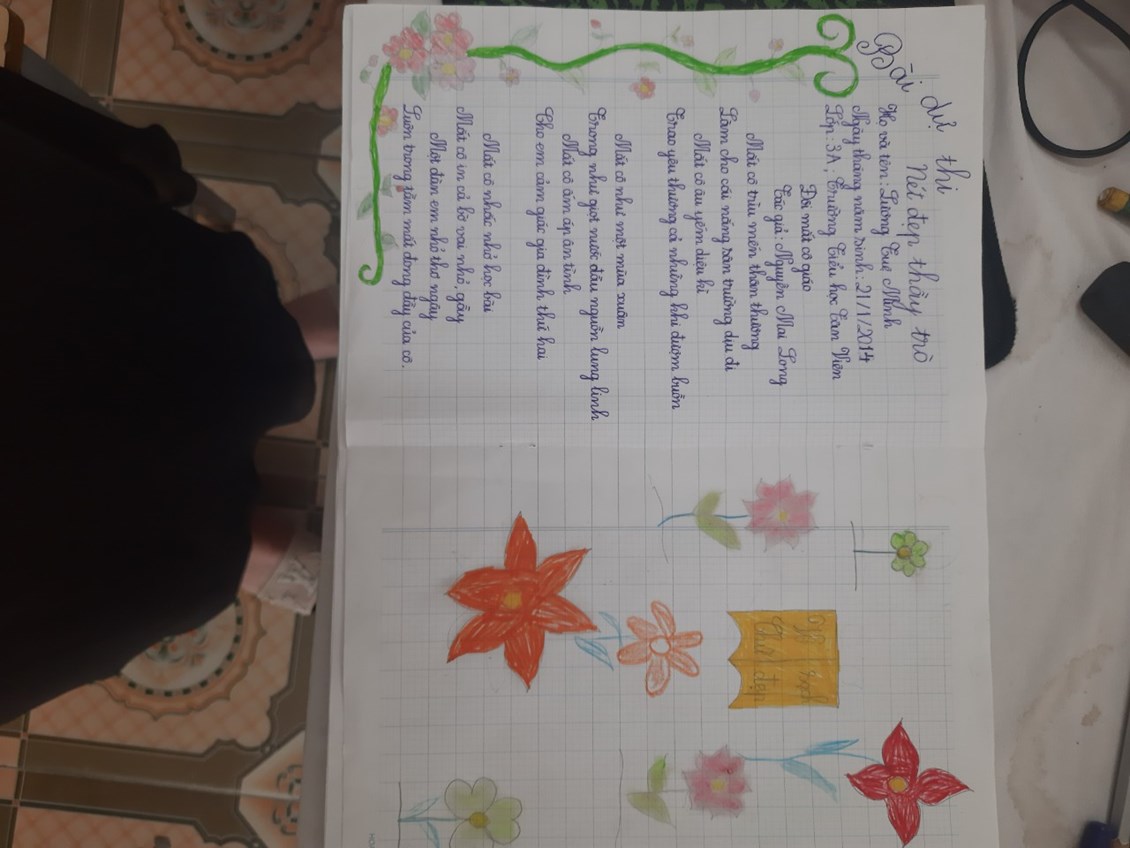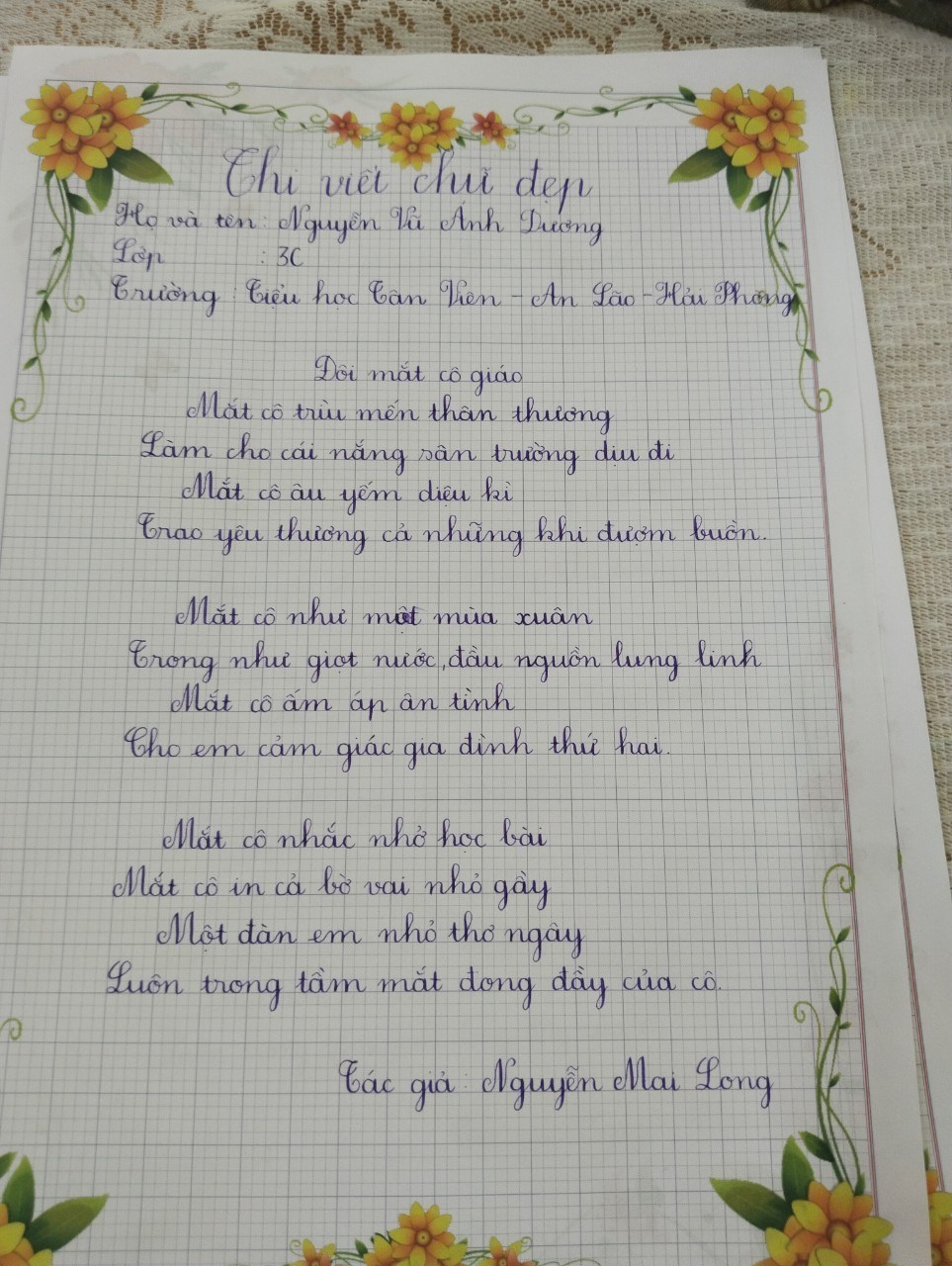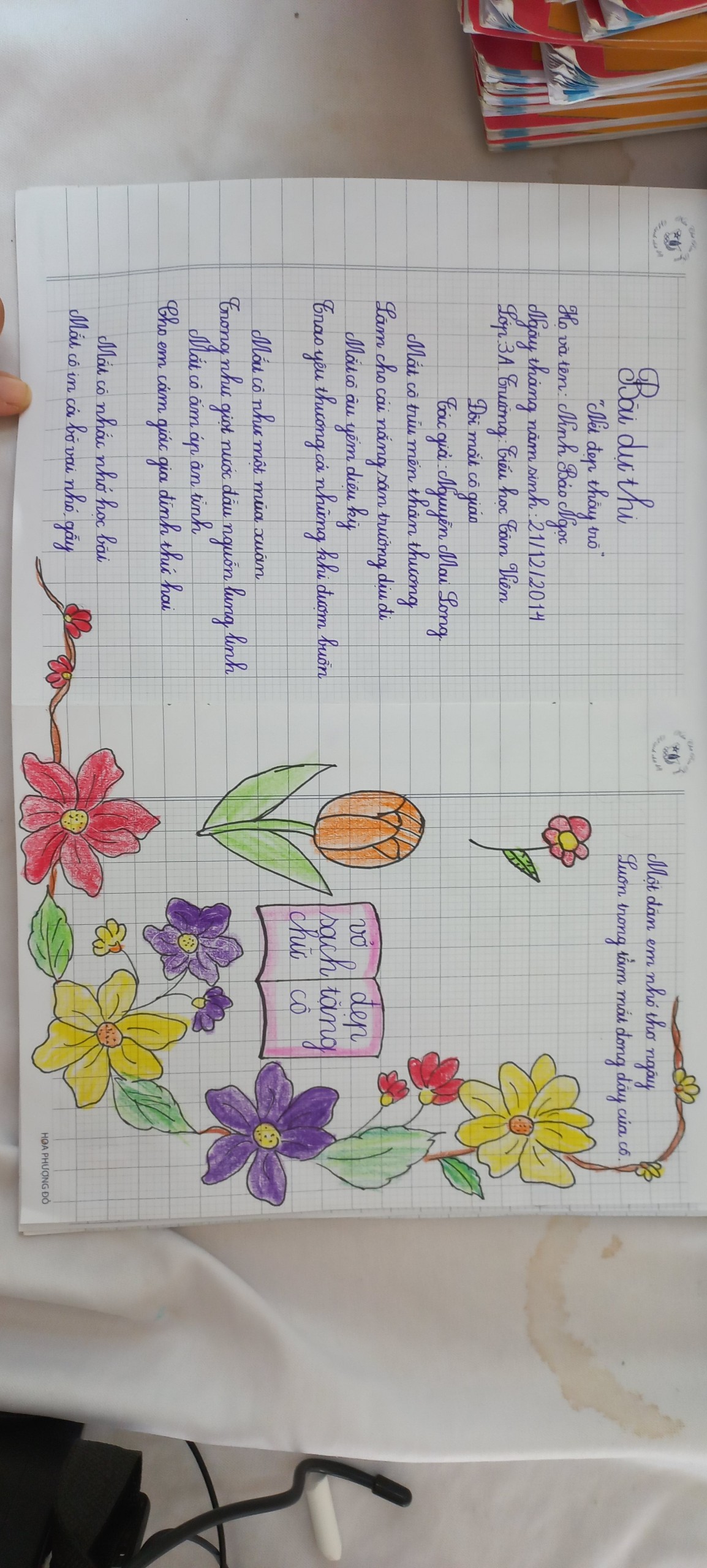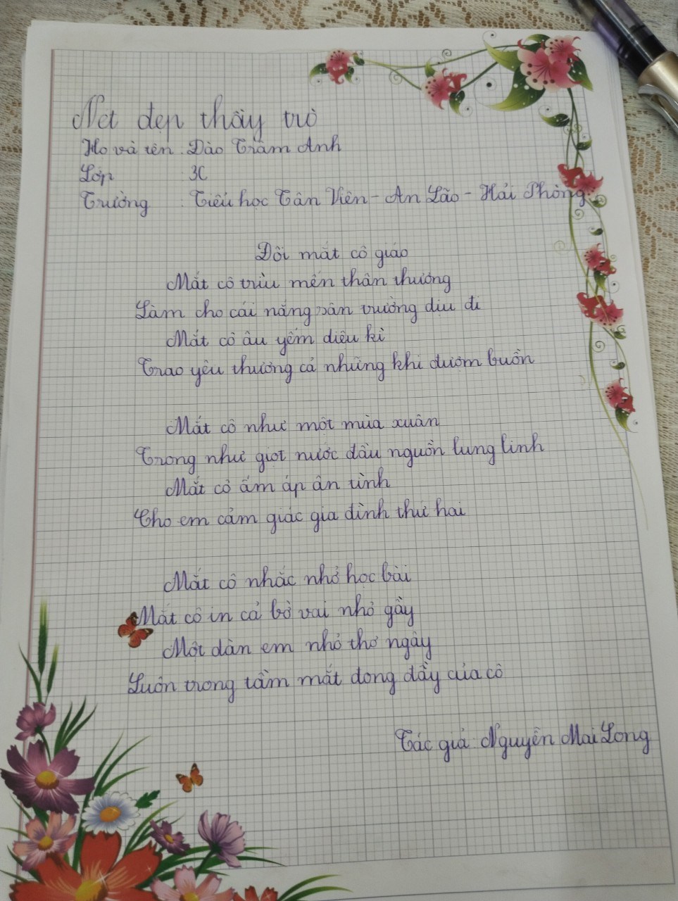 Đó là tình cảm là tấm lòng của học sinh Trường TH Tân Viên nói chung và học sinh khối 3 nói riêng dành tặng các thầy cô. Một việc làm ý nghĩa thể hiện tình cảm của các em đó là những bài viết đẹp hưởng cũng cuộc thi " Nét đẹp thầy trò" đó cũng là những bài chữ đeph tặng thầy cô. Dươi đây là một số bài của các em: