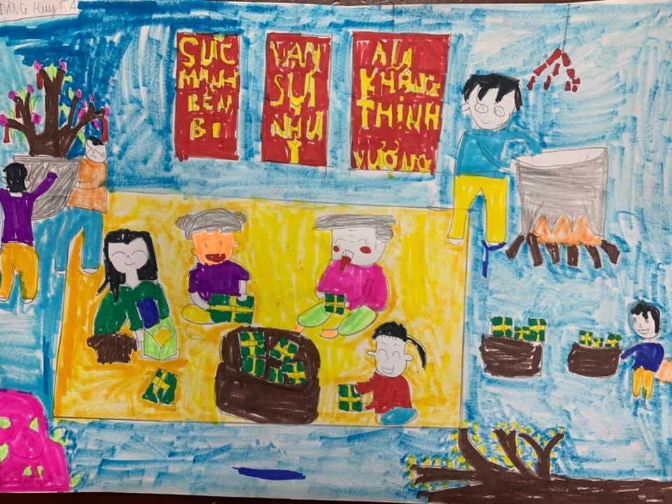 Với những ý tưởng bất ngờ, mới mẻ, các bạn nhỏ đã khắc họa lại nét đẹp thiên nhiên, khung cảnh các thành viên trong gia đình quây quần bên nhau. Bên cạnh đó, các hoạt động lễ hội diễn ra vào ngày Tết, dòng người náo nức đi chợ Tết, mua sắm,…cũng đều được các bạn nhỏ tái hiện sinh động trong bức tranh ngày Tết và mùa xuân của mình