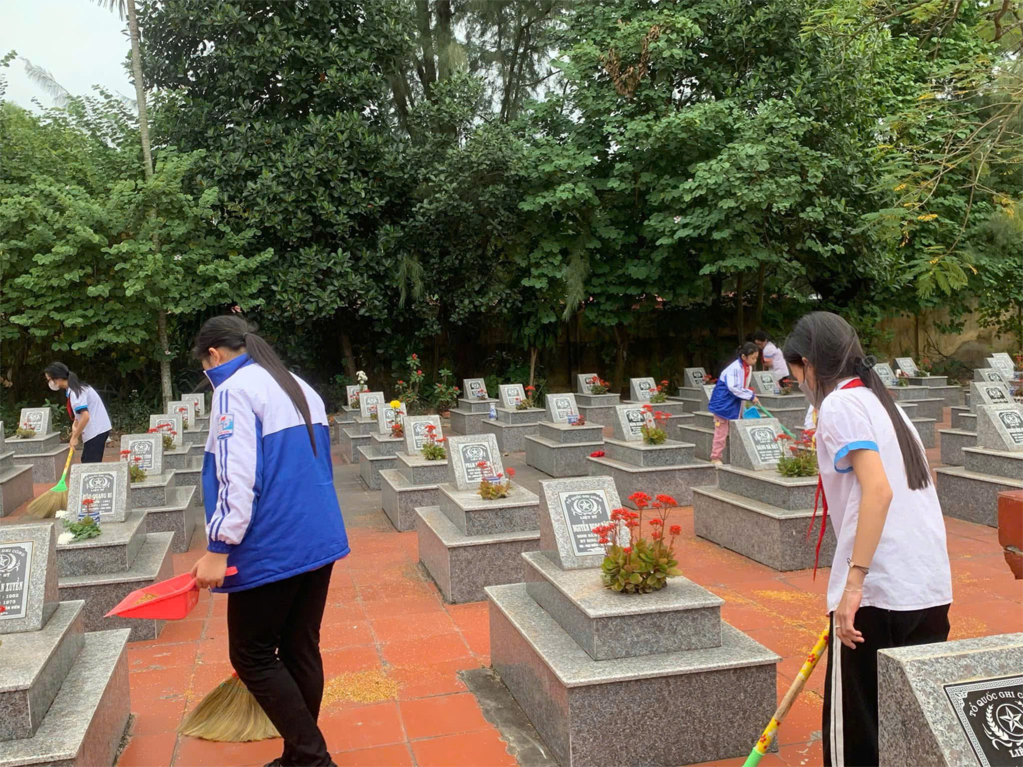 Đoàn viên thanh niên , HS đã tham gia thắp hương quét dọn, nhổ cỏ, làm vệ sinh các phần mộ, môi trường trong toàn bộ khuôn viên của nghĩa trang.