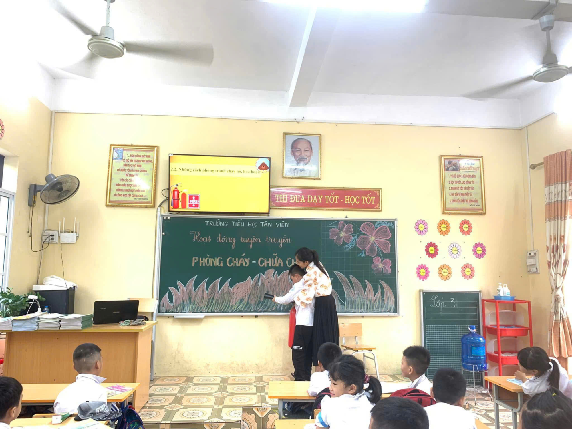 Với mục đích tuyên truyền cho học sinh về kĩ năng Phòng cháy chữa cháy, trường tiểu học Tân Viên chỉ đạo các lớp tổ chức hoạt động tuyên truyền phòng cháy chữa cháy đến các em học sinh