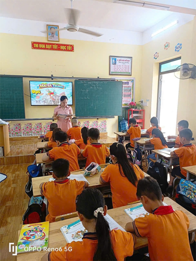Trong quá trình tìm hiểu nội dung bài, cô giáo đã khéo léo sử dụng AI để tạo câu hỏi tương tác, luyện đọc cá nhân, đọc nhóm và hỗ trợ giải nghĩa từ khó. Học sinh tích cực tham gia các hoạt động, mạnh dạn bày tỏ suy nghĩ, thể hiện sự hiểu biết về tinh thần yêu nước và ý chí quật cường của Hai Bà Trưng.