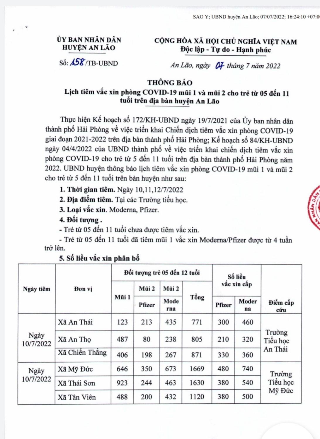 Thông báo số 158/TB-UBND ngày 07/7/2022 của UBND huyện An Lão về Lịch tiêm phòng vắc xin phòng COVID-19 mũi 1 và mũi 2 cho từ 05 đến 11 tuổi trên địa bàn huyện An Lão