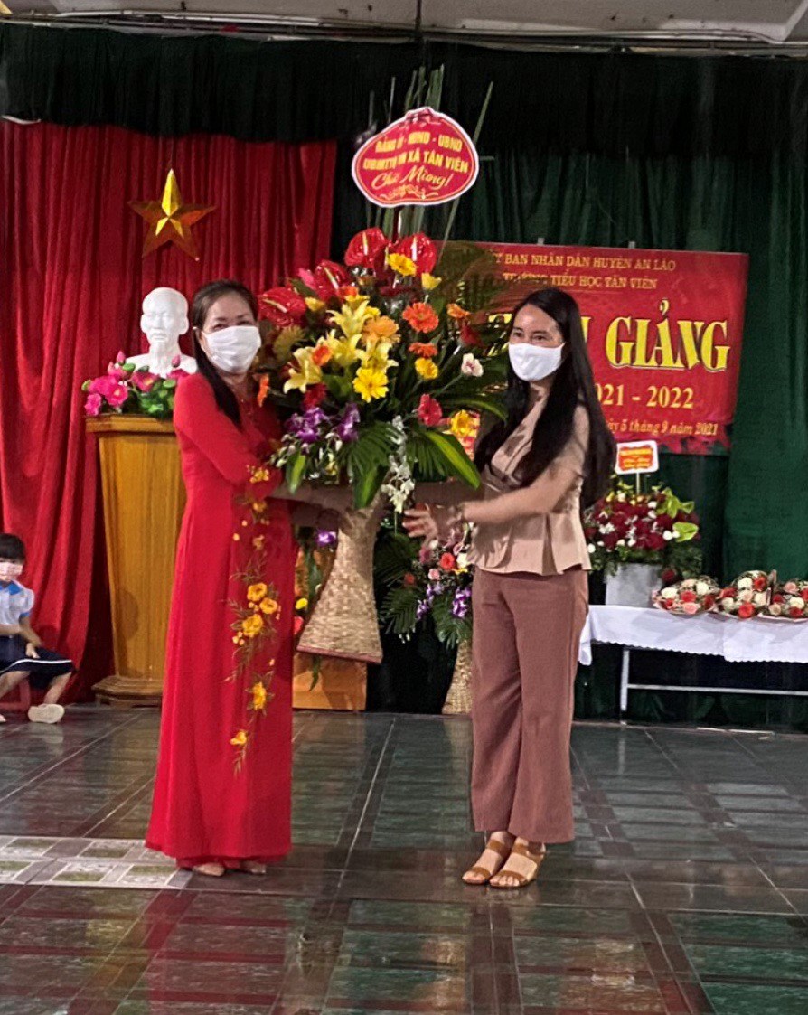 Bà Ngô Thị Hải Ninh - Bí thư Đảng ủy xã Tân Viên tặng hoa nhà trường